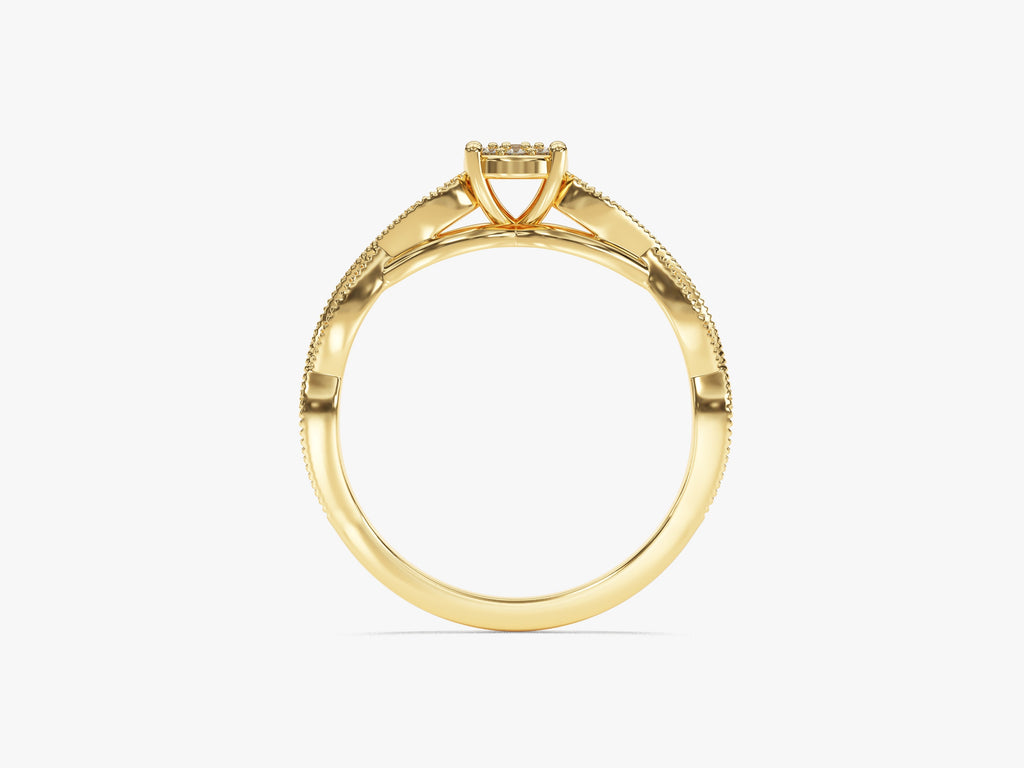 This ring features dazzling moissanites with a milgrain-detailed twisted band. It is a perfect blend of vintage-inspired elegance and modern sophistication.
