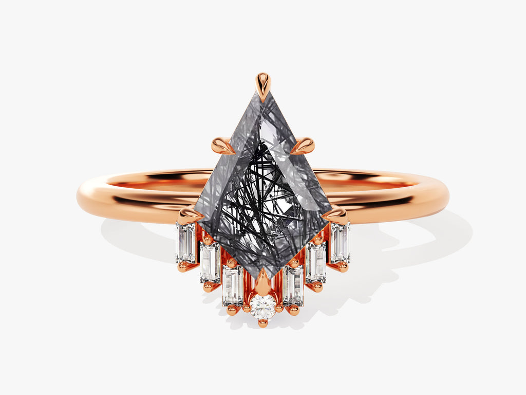 Kite Black Rutilated Quartz Engagement Ring with Baguette Moissanite Sidestones