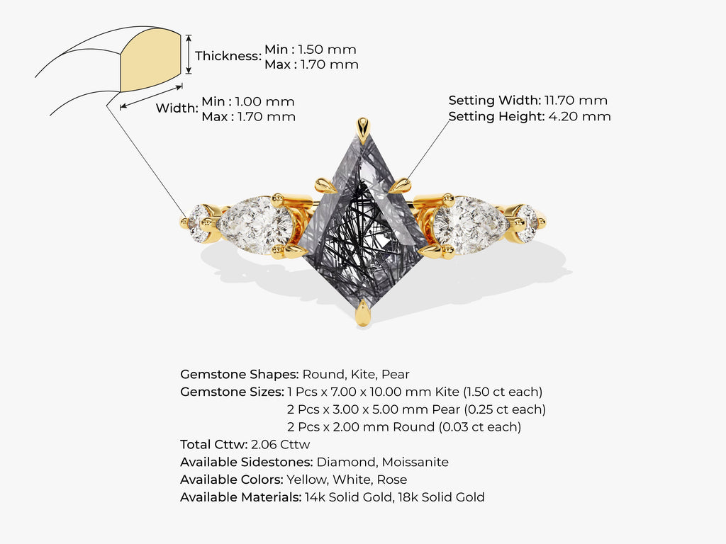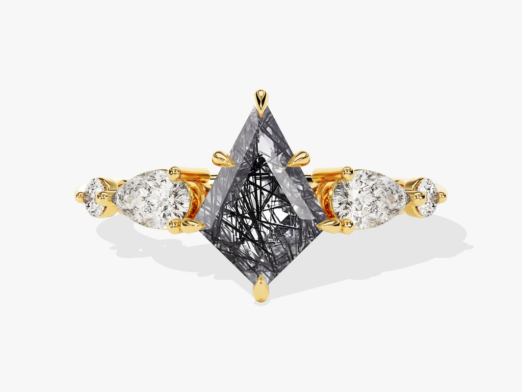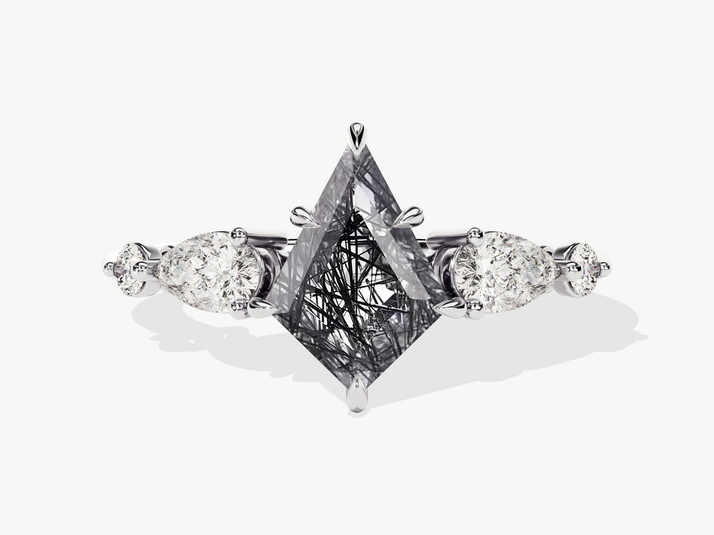 The Kite Black Rutile Engagement Ring with Pear Moissanite Sidestones is a bold and sophisticated symbol of love, meticulously designed to showcase the deep, mysterious allure of kite-shaped black rutile quartz at the center, complemented by the brilliant sparkle of pear-shaped moissanite sidestones.