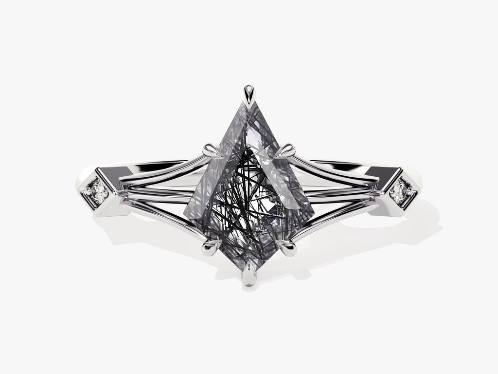 The Kite Black Rutile Split Shank Engagement Ring with Moissanite Accents is a bold and modern symbol of love, meticulously designed to showcase the deep, mysterious beauty of kite-shaped black rutile quartz within a split shank band, accented by the dazzling brilliance of moissanite sidestones.