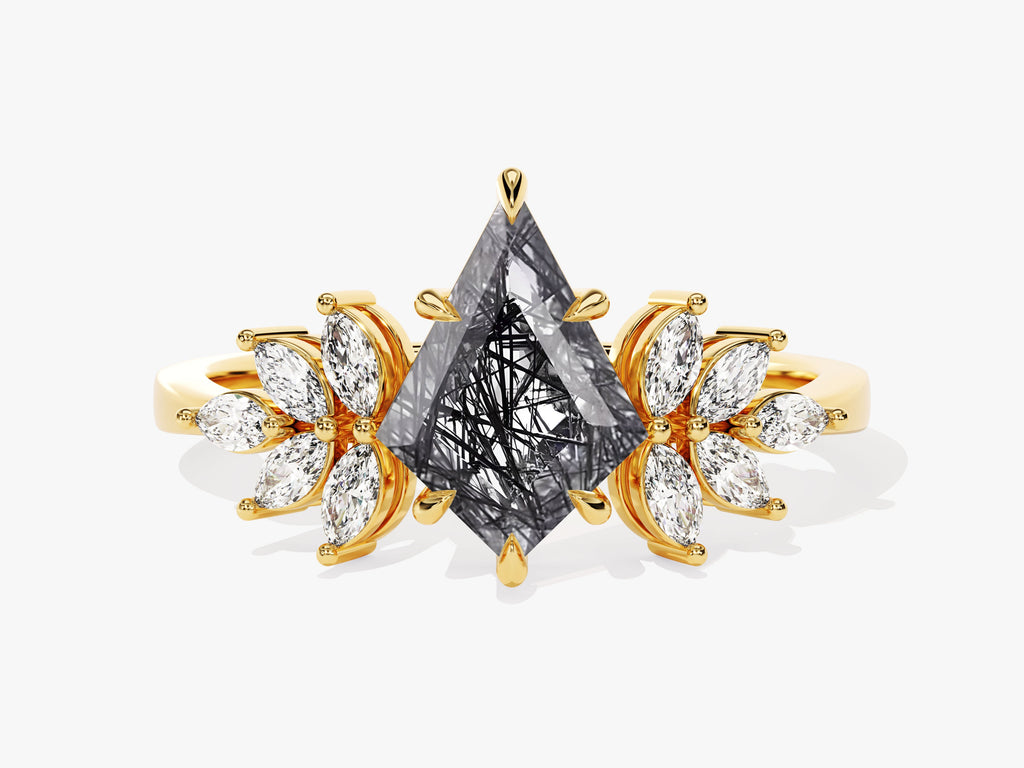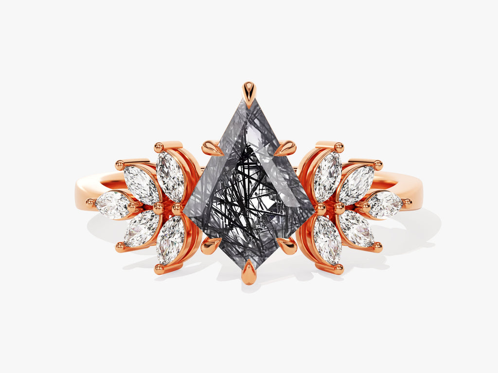 The Kite Black Rutile Vintage Engagement Ring with Moissanite Sidestones is a genuinely captivating piece that showcases a unique and modern aesthetic. This ring features a kite-shaped black rutile center stone, creating a striking and alluring contrast against the shimmering moissanite sidestones.