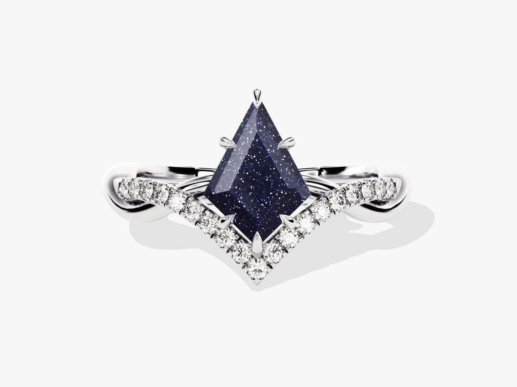 Immerse yourself in the modern elegance of our Kite Blue Sandstone Curved Engagement Ring, featuring a captivating kite-cut blue sandstone as its centerpiece. The shimmering particles within the blue sandstone evoke a sense of celestial beauty, creating a unique and enchanting focal point. The stone's distinctive shape is complemented by a gracefully curved line that adds a contemporary and artistic touch to the design.