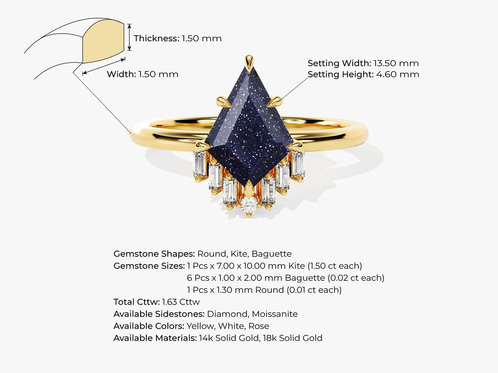 The Kite Blue Sandstone Engagement Ring with Baguette Moissanite Sidestones is an artistic marvel, seamlessly blending celestial allure with modern elegance. The focal point of this mesmerizing ring is a kite-shaped blue sandstone, evoking the serene beauty of a starlit night sky with its deep and captivating blue hue.