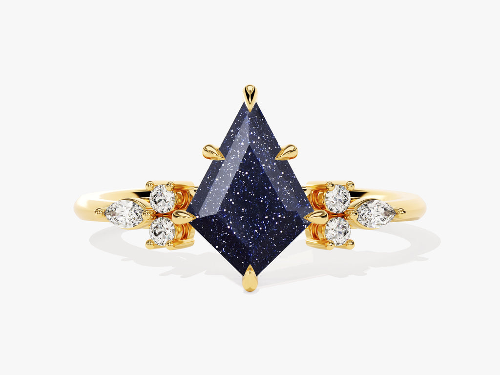 The Kite Blue Sandstone Engagement Ring with Marquise Moissanite Sidestones is a captivating and contemporary symbol of love, thoughtfully designed to feature the deep, celestial blue of a kite-shaped blue sandstone, complemented by the brilliant sparkle of marquise-cut moissanite sidestones.