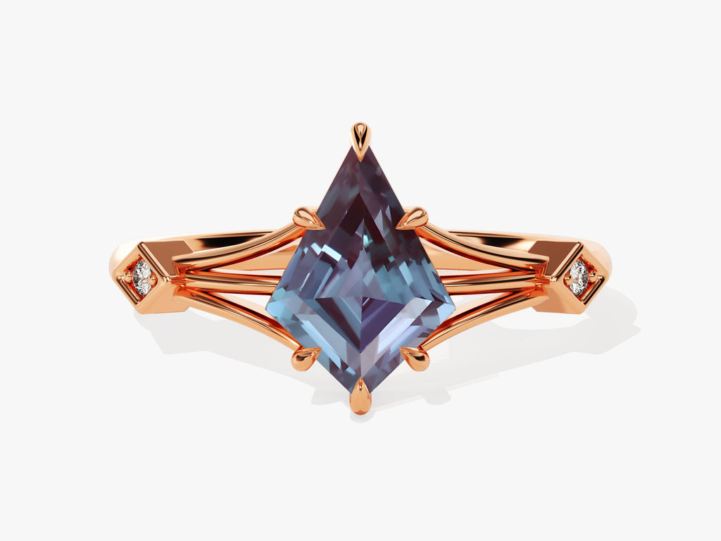 The Kite Alexandrite Split Shank Engagement Ring with Moissanite Accents is an exquisite and modern symbol of love, meticulously designed to showcase the enchanting color-changing properties of a kite-shaped alexandrite within a split shank band, complemented by the dazzling brilliance of moissanite sidestones.