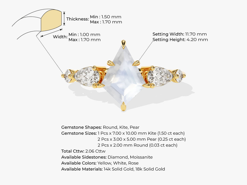 At the heart of the ring is a kite-shaped moonstone, a gemstone renowned for its enchanting play-of-color and luminous glow, reminiscent of moonlight dancing on water. The moonstone becomes the focal point, evoking a sense of romance and mystery.