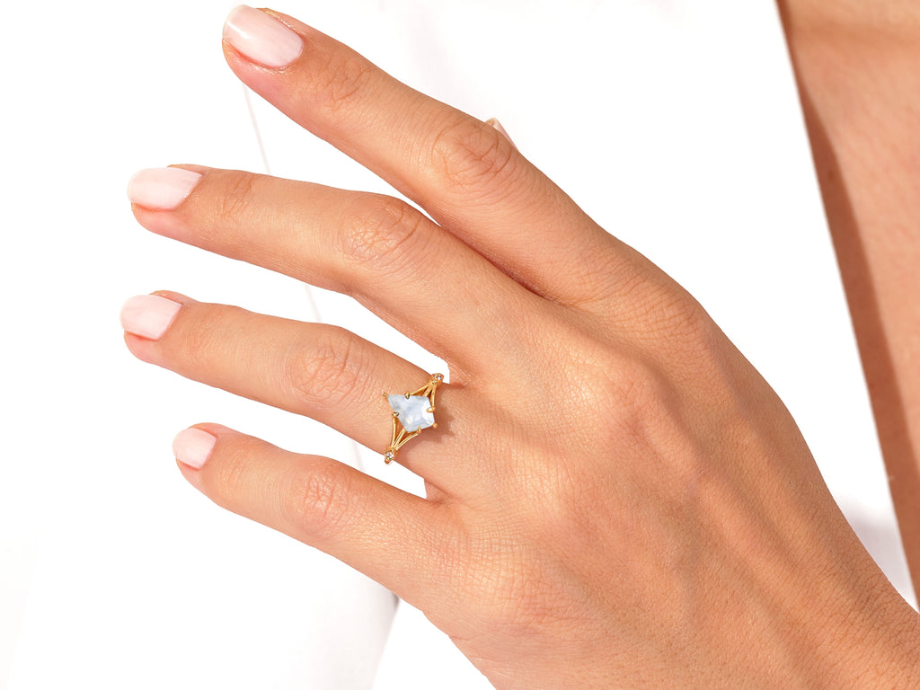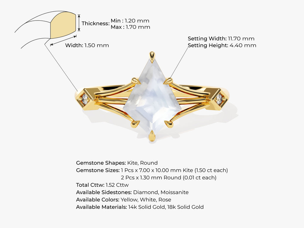 Combining the kite-shaped moonstone, split shank, and moissanite sidestones creates a harmonious blend of modern sophistication and celestial charm. The Kite Moonstone Split Shank Engagement Ring with Moissanite Sidestones is a perfect choice for those who appreciate the contemporary aesthetic and desire a ring that symbolizes a unique and enduring love with a touch of celestial magic.