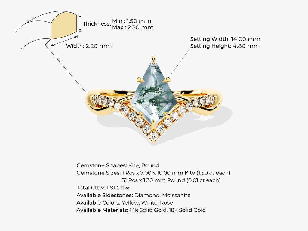 Celebrate the beauty of nature with our Kite Moss Agate Curved Engagement Ring, featuring a captivating kite-cut moss agate as its centerpiece. The intricate patterns within the moss agate evoke the organic charm found in the natural world, creating a uniquely enchanting focal point. The stone's distinctive shape is complemented by gracefully curved lines.