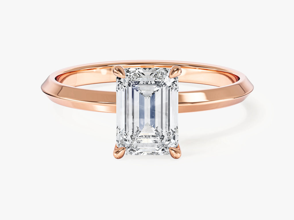 Behold the enchantment of our Knife Edge Emerald Lab Grown Diamond Engagement Ring, a harmonious blend of classic allure with a contemporary twist. This extraordinary ring showcases a brilliant emerald-cut lab-grown diamond, meticulously crafted to emphasize its remarkable clarity and mesmerizing charm. The knife-edge band design adds a modern and refined touch, symbolizing the precision and distinct facets of your love.