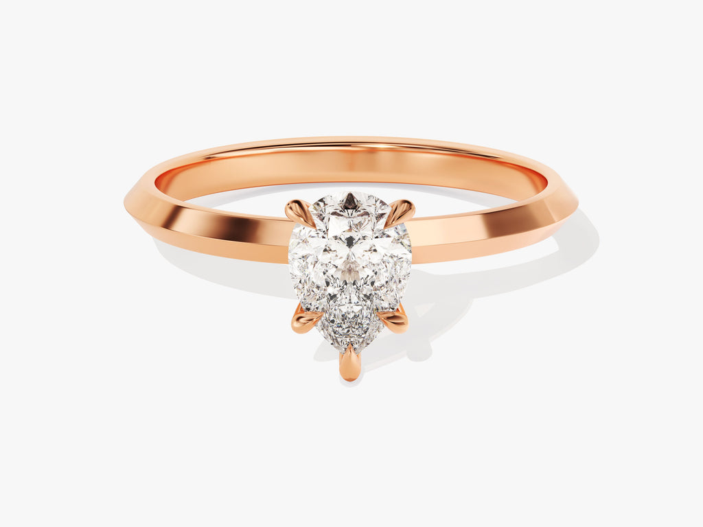 The Knife Edge Pear Moissanite Engagement Ring is a graceful and timeless symbol of love and commitment. At its core, this exquisite ring features a dazzling pear-shaped moissanite, celebrated for its elegant teardrop-like shape and remarkable brilliance. What sets this ring apart is its sleek and graceful knife-edge band design. The band narrows to a delicate point beneath the central heart-shaped moissanite, adding a touch of refinement and simplicity to the overall design.