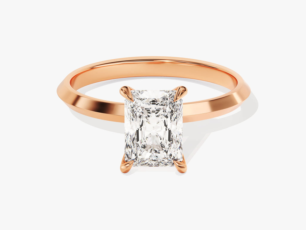 Embrace the profound beauty of our Knife Edge Radiant Lab Grown Diamond Engagement Ring, a masterpiece that harmoniously combines classic charm with a contemporary twist. This extraordinary ring showcases a brilliant radiant-cut lab-grown diamond, meticulously created to emphasize its remarkable clarity and mesmerizing charm. The knife-edge band design adds a contemporary and refined touch.