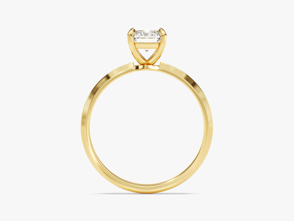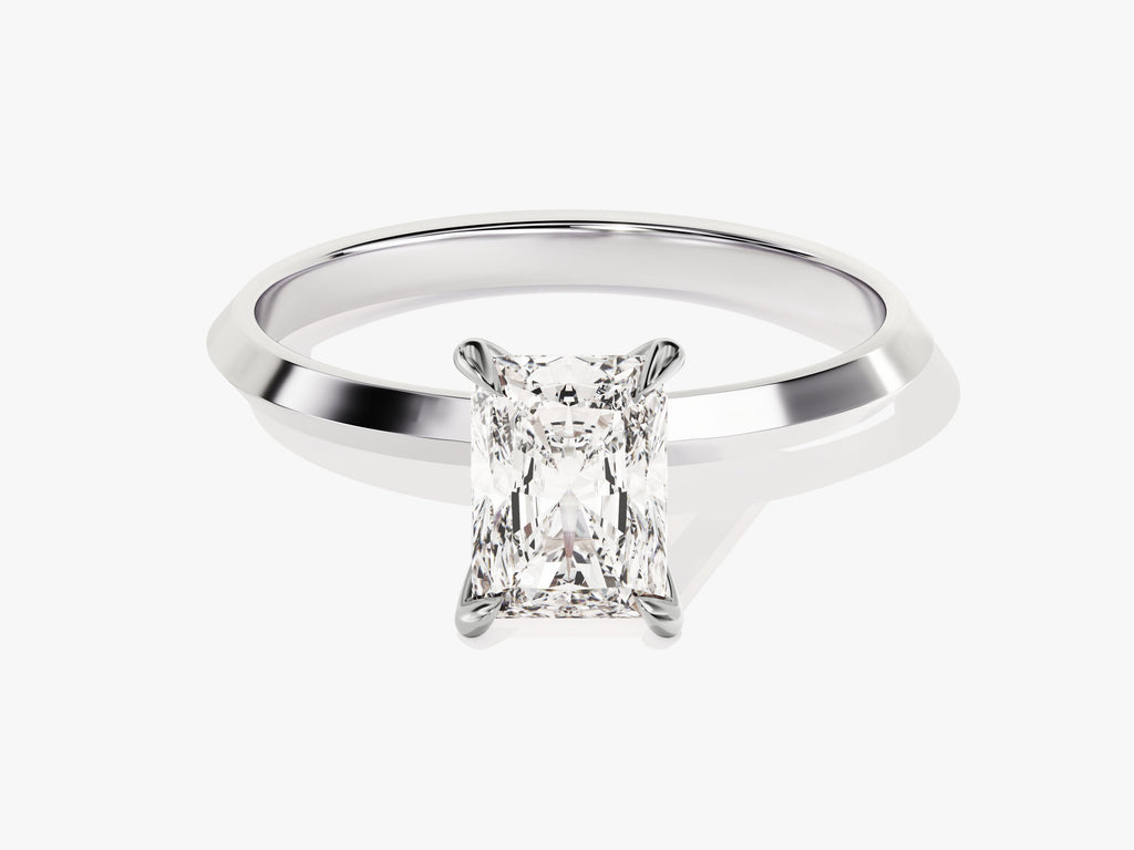The Knife Edge Radiant Moissanite Engagement Ring is a stunning and elegant symbol of love and commitment. At its core, this exquisite ring features a brilliant radiant-cut moissanite, renowned for its rectangular shape with trimmed corners and remarkable brilliance. Its sleek and graceful knife-edge band design sets this ring apart. The band narrows to a delicate point beneath the central radiant moissanite, adding a touch of refinement and simplicity to the overall design.