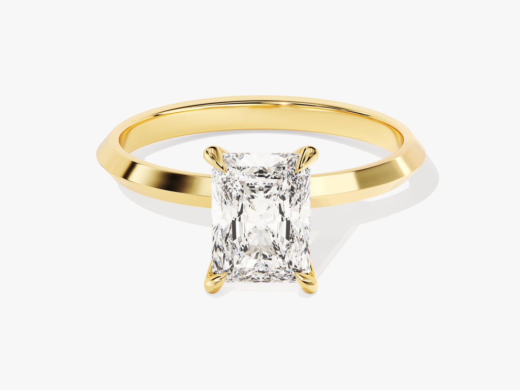 Embrace the profound beauty of our Knife Edge Radiant Diamond Engagement Ring, a masterpiece that harmoniously combines classic charm with a contemporary twist. This extraordinary ring showcases a brilliant radiant-cut diamond, meticulously created to emphasize its remarkable clarity and mesmerizing charm. The knife-edge band design adds a contemporary and refined touch.