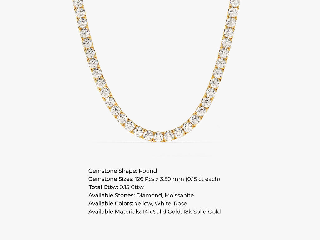 The Lab Diamond Tennis Necklace is a luxurious piece of jewelry showcasing lab-grown diamonds with a diameter of 3.50 millimeters. This necklace follows the classic tennis style, featuring a continuous line of these dazzling lab-created diamonds.