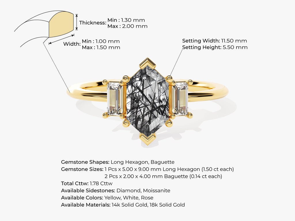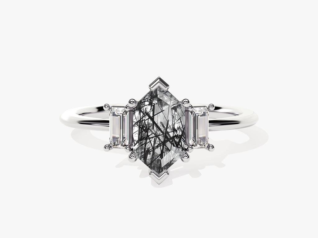 Long Hexagon Black Rutilated Quartz Engagement Ring with Baguette Moissanite Sidestones