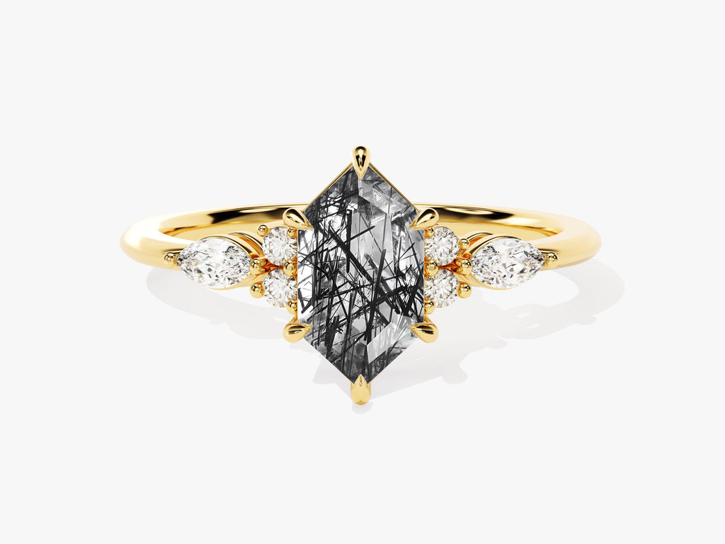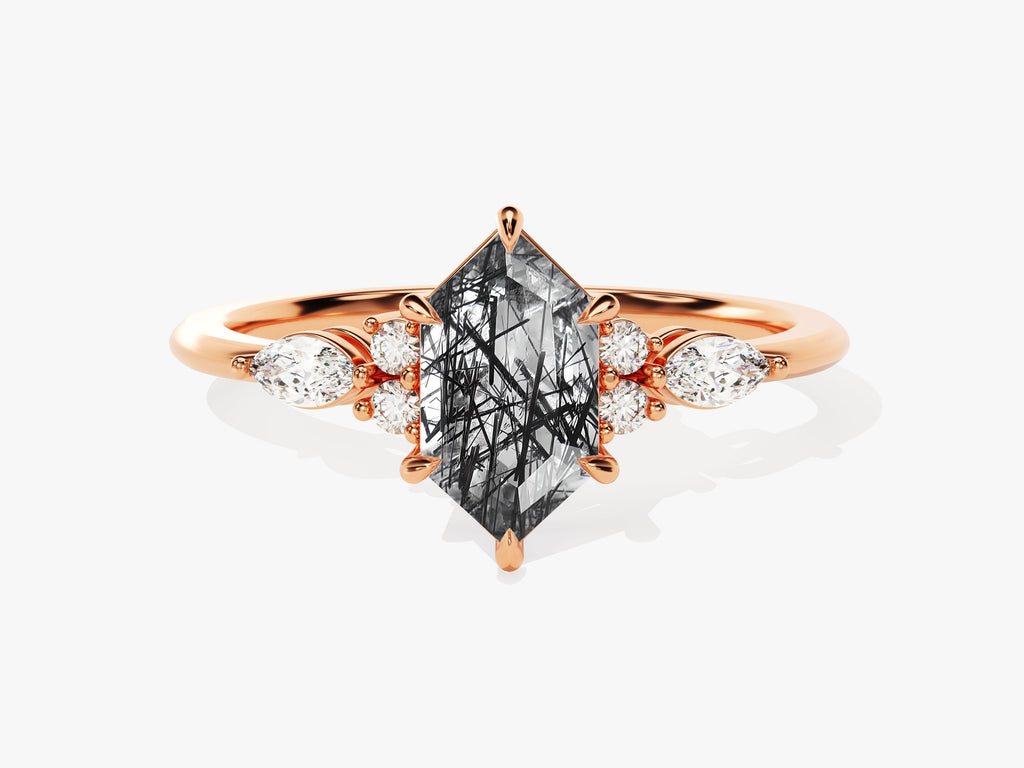 Long Hexagon Black Rutilated Quartz Engagement Ring with Marquise Moissanite Sidestones