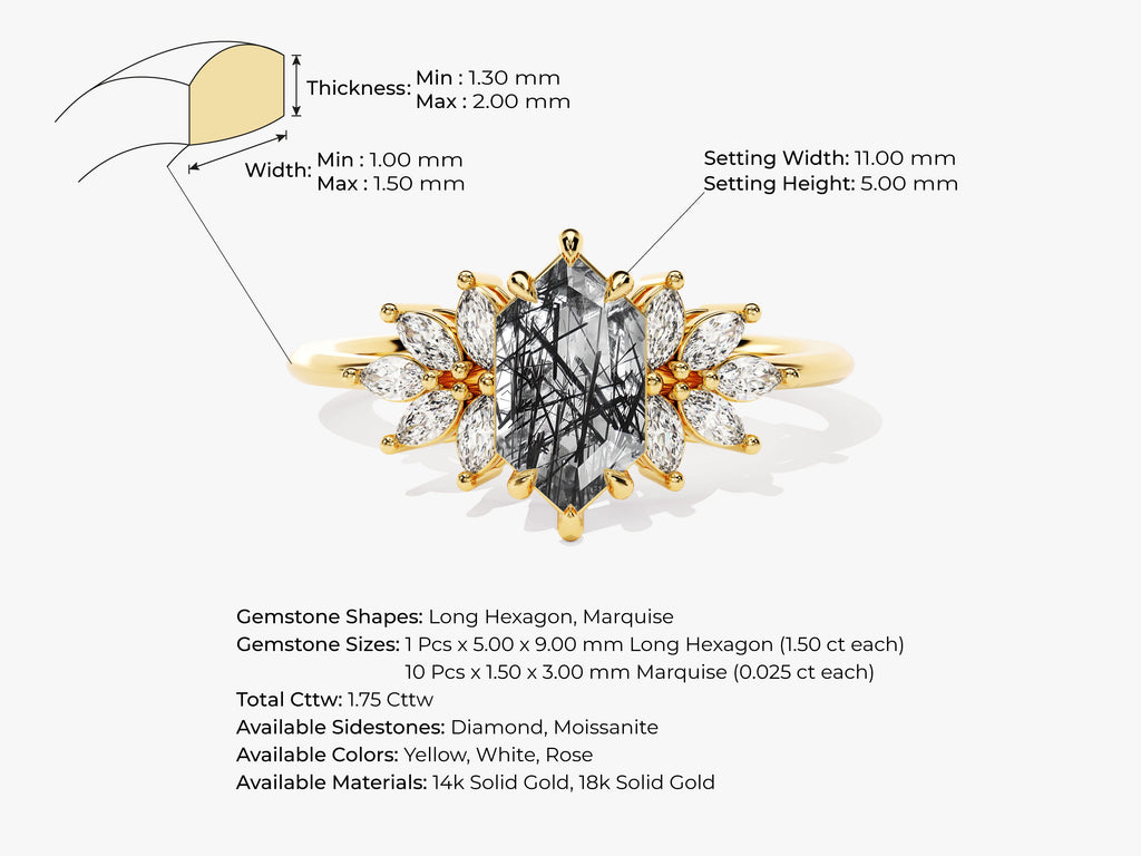 Elegance meets modernity in our Long Hexagon Black Rutile Engagement Ring with Moissanite Sidestones. Crafted to perfection, this stunning piece features a bold long hexagon-shaped black rutile center stone, radiating sophistication and individuality. The exquisite moissanite sidestones add a touch of brilliance, creating a harmonious balance between classic and contemporary design.
