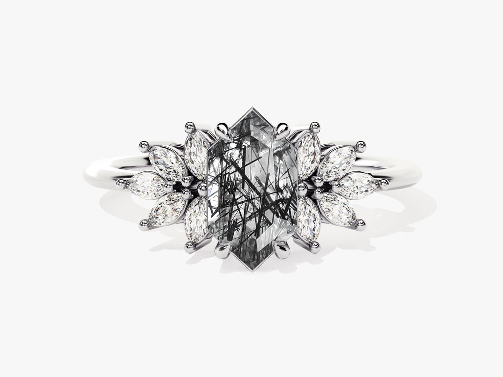Long Hexagon Black Rutilated Quartz Engagement Ring with Moissanite Sidestones