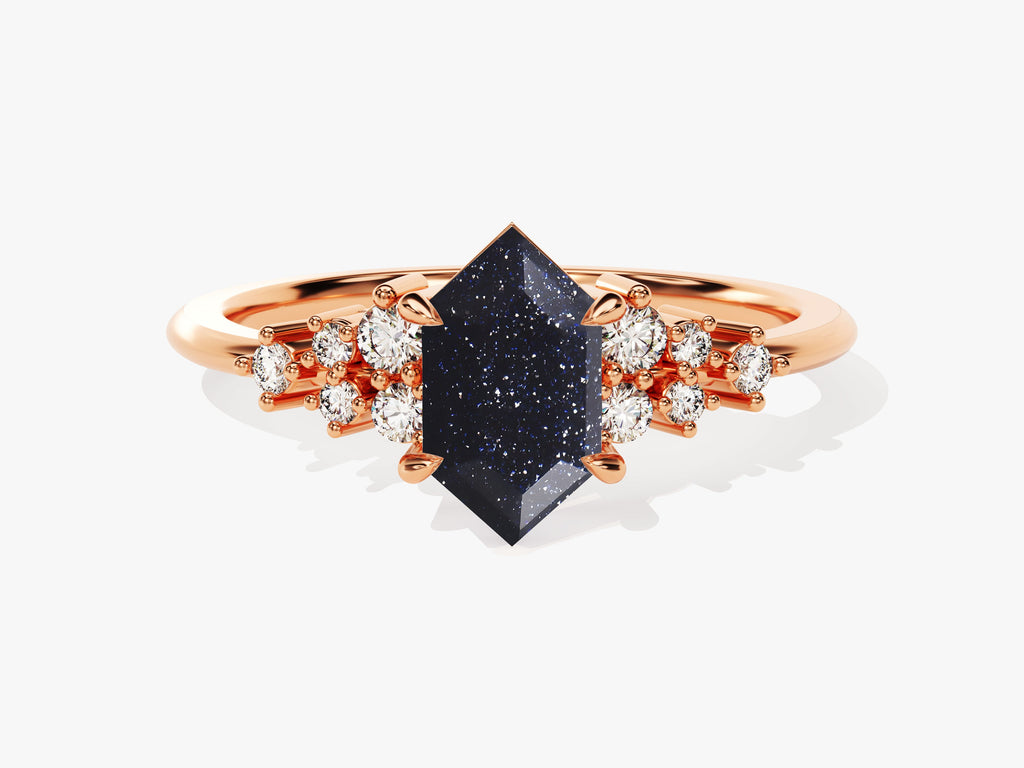 Immerse yourself in celestial elegance with our Long Hexagon Blue Sandstone Engagement Ring, adorned by a dazzling Moissanite Cluster. The centerpiece features a captivating long hexagon-cut blue sandstone, reminiscent of a starlit night sky with its shimmering particles.