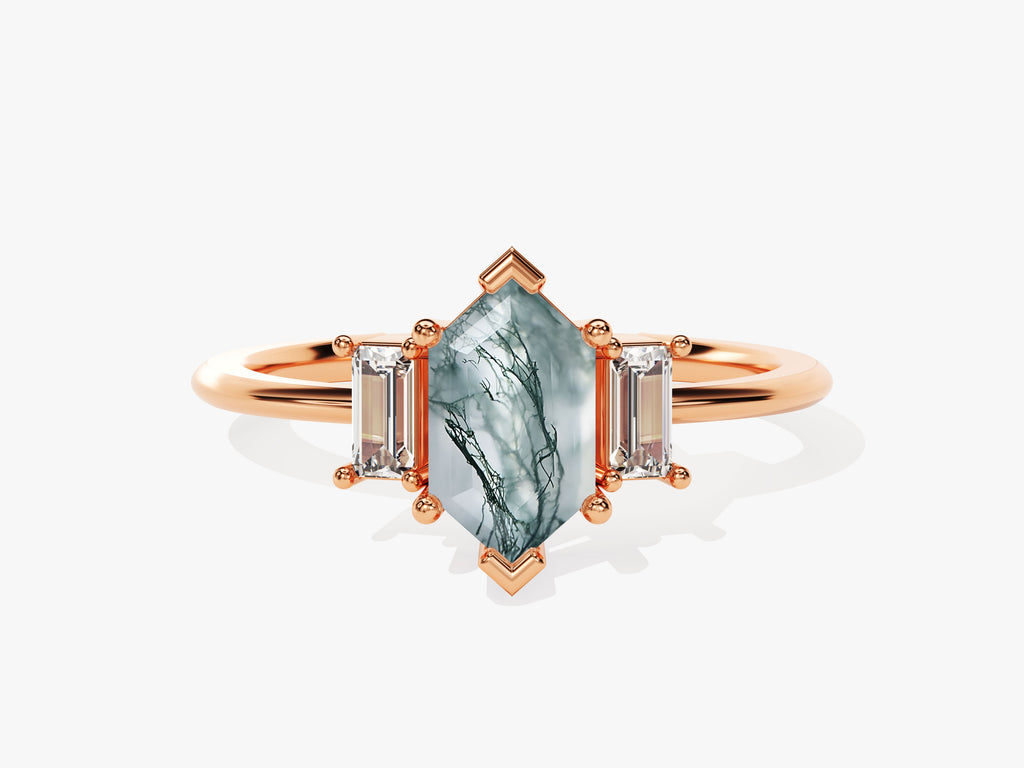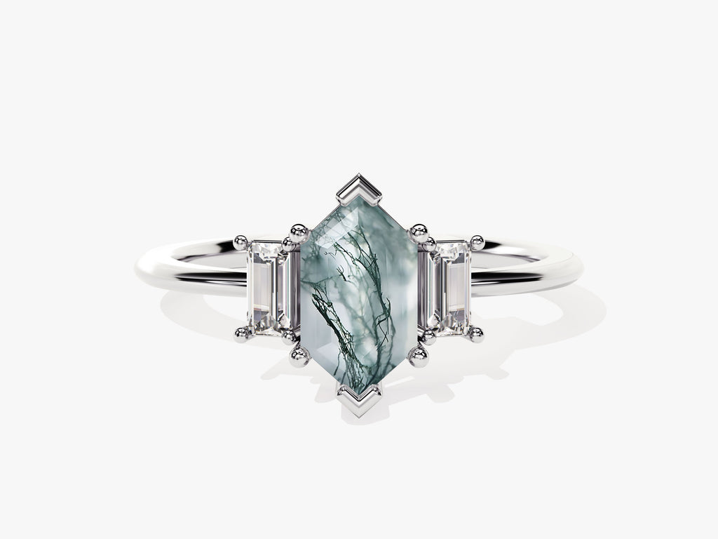 Long Hexagon Moss Agate Engagement Ring with Baguette Moissanite Sidestones