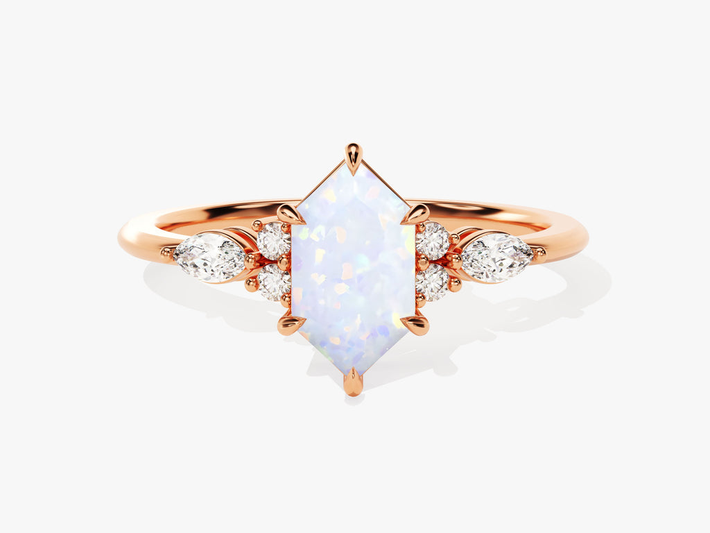 Long Hexagon Opal Engagement Ring with Marquise Moissanite Sidestones