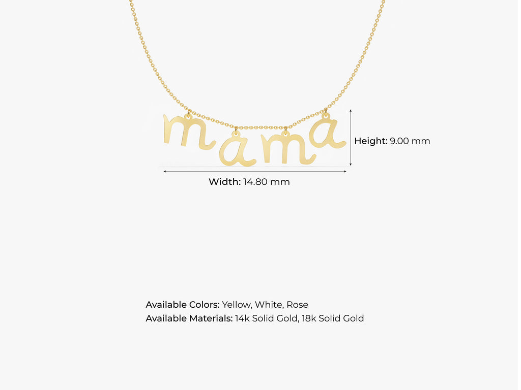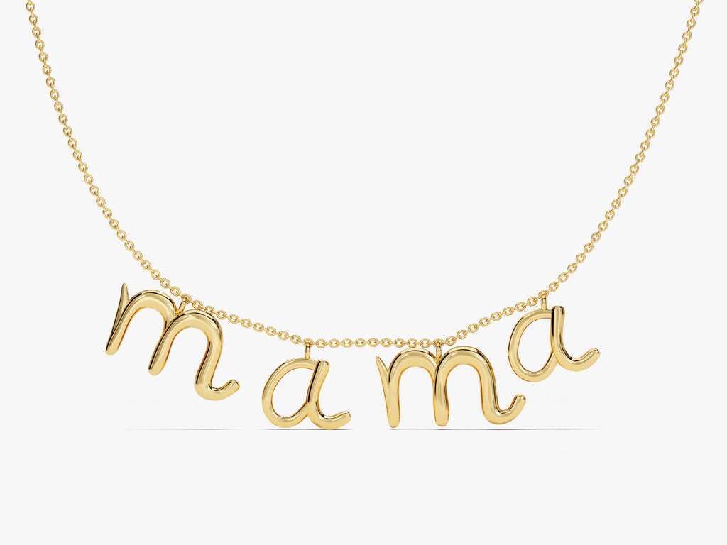 A Mama Charm Necklace is a sentimental piece of jewelry featuring a charm that spells out the word "Mama." The charm is crafted from solid gold, gold vermeil or sterling silver, giving it durability and a luxurious appearance.