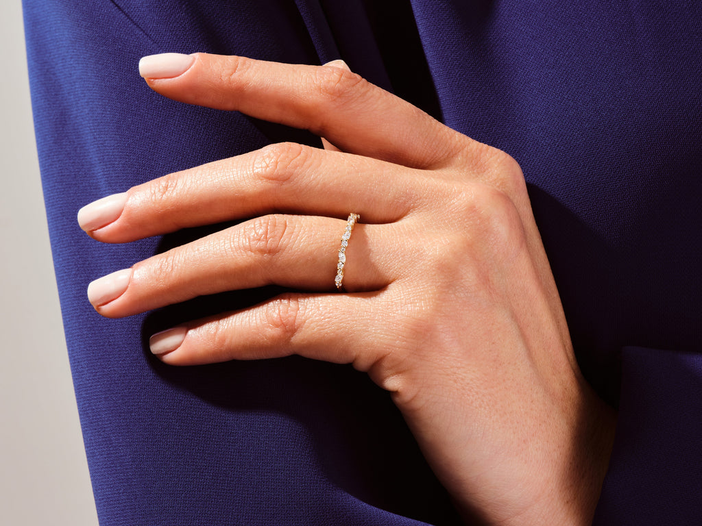This sleek and luminous wedding band boasts a unique combination of a marquise and double round moissanites. If you wish to add a little bit of dazzling sparkle to your everyday style and special occasions like your big day or anniversary, this band is the perfect choice to do so.