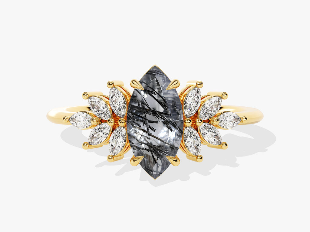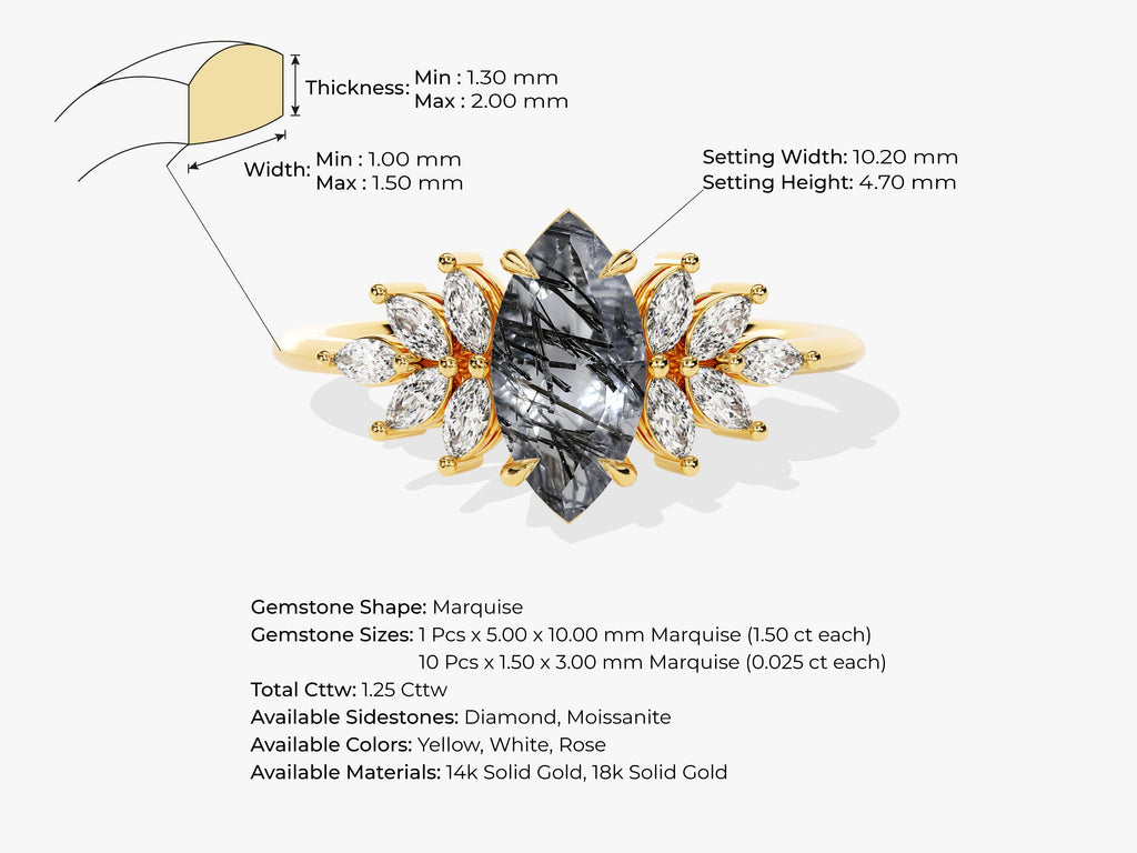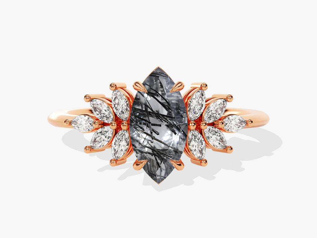 The Marquise Black Rutile Vintage Engagement Ring with Moissanite Sidestones is a striking and sophisticated symbol of love, meticulously designed to showcase the deep, mysterious allure of black rutile within a vintage-inspired setting, accentuated by the brilliant sparkle of moissanite sidestones.