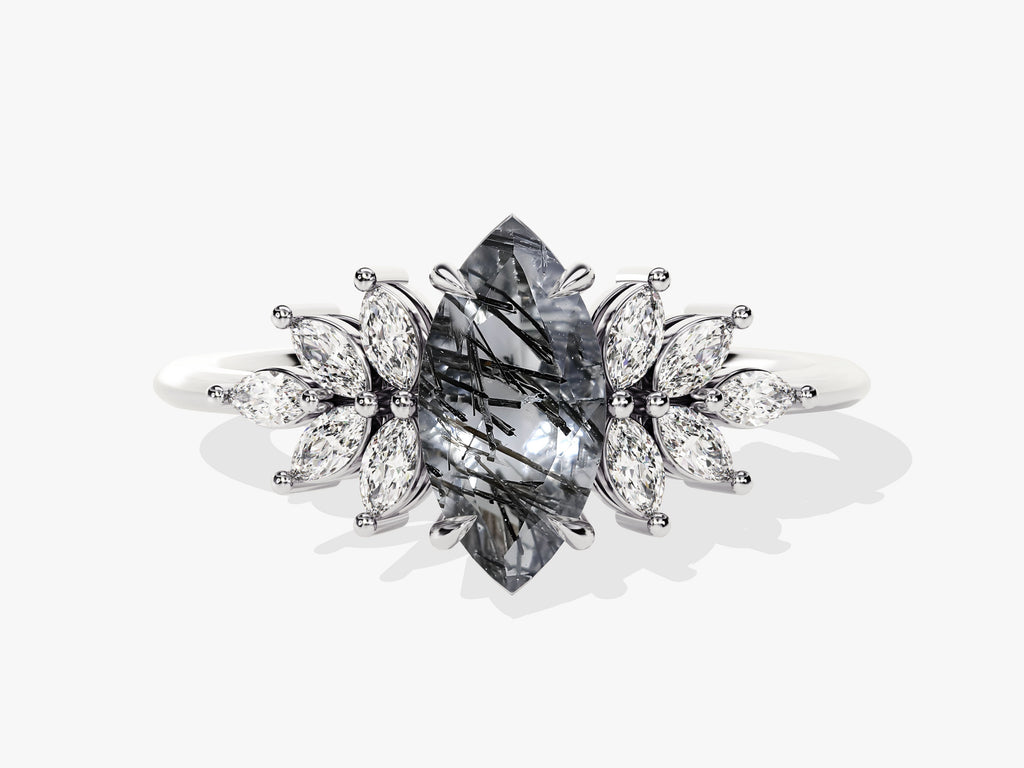 Marquise Black Rutilated Quartz Vintage Engagement Ring with Moissanite Sidestones