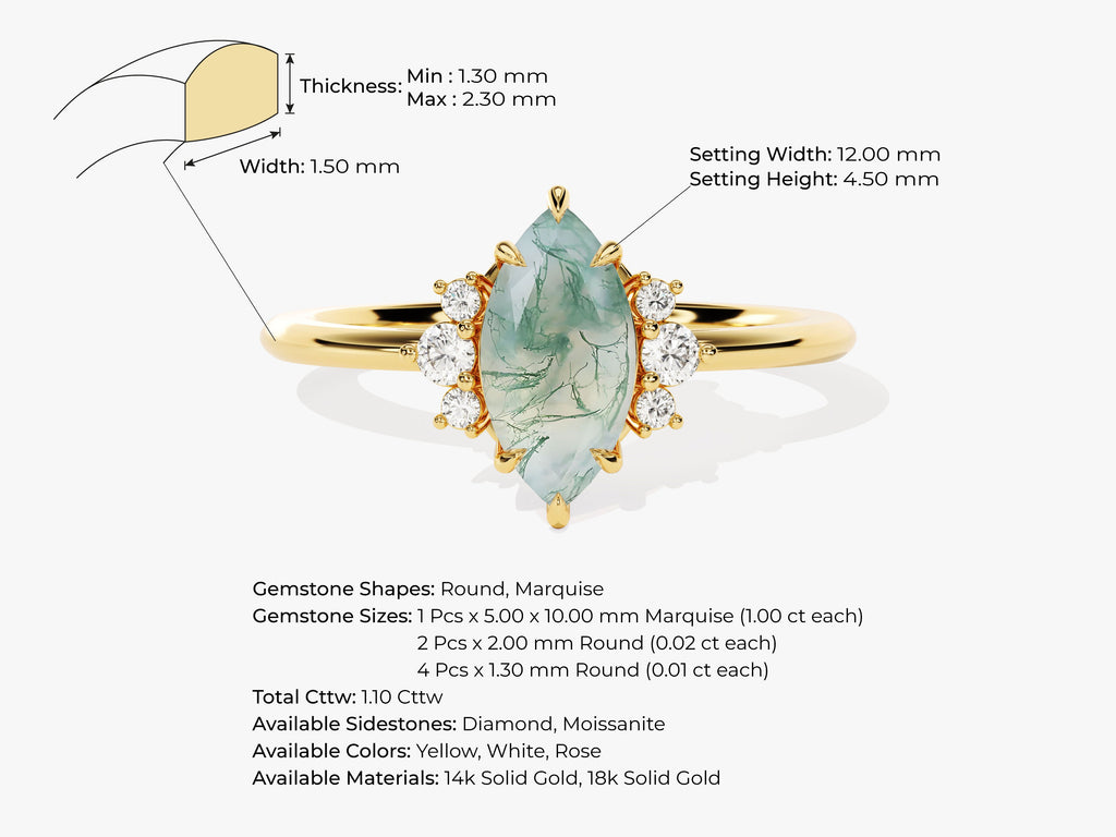 Discover the natural beauty of our Marquise Moss Agate Engagement Ring‚ ode to the earth's elegance and the everlasting spirit of love. The marquise-cut moss agate, adorned with organic patterns, becomes a symbol of growth and enduring connection. Encircled by round moissanite sidestones, this ring is a harmonious blend of nature's charm and modern sophistication.