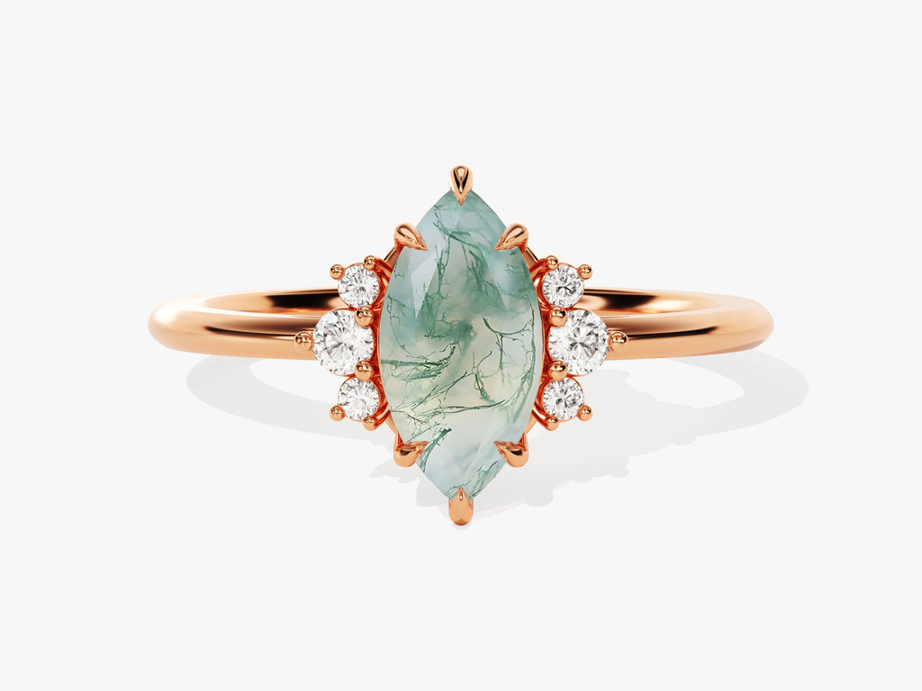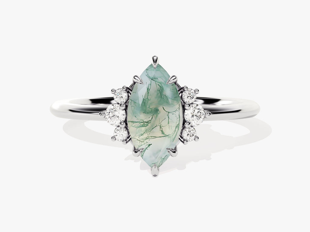 Marquise Moss Agate Engagement Ring with Round Moissanite Sidestones