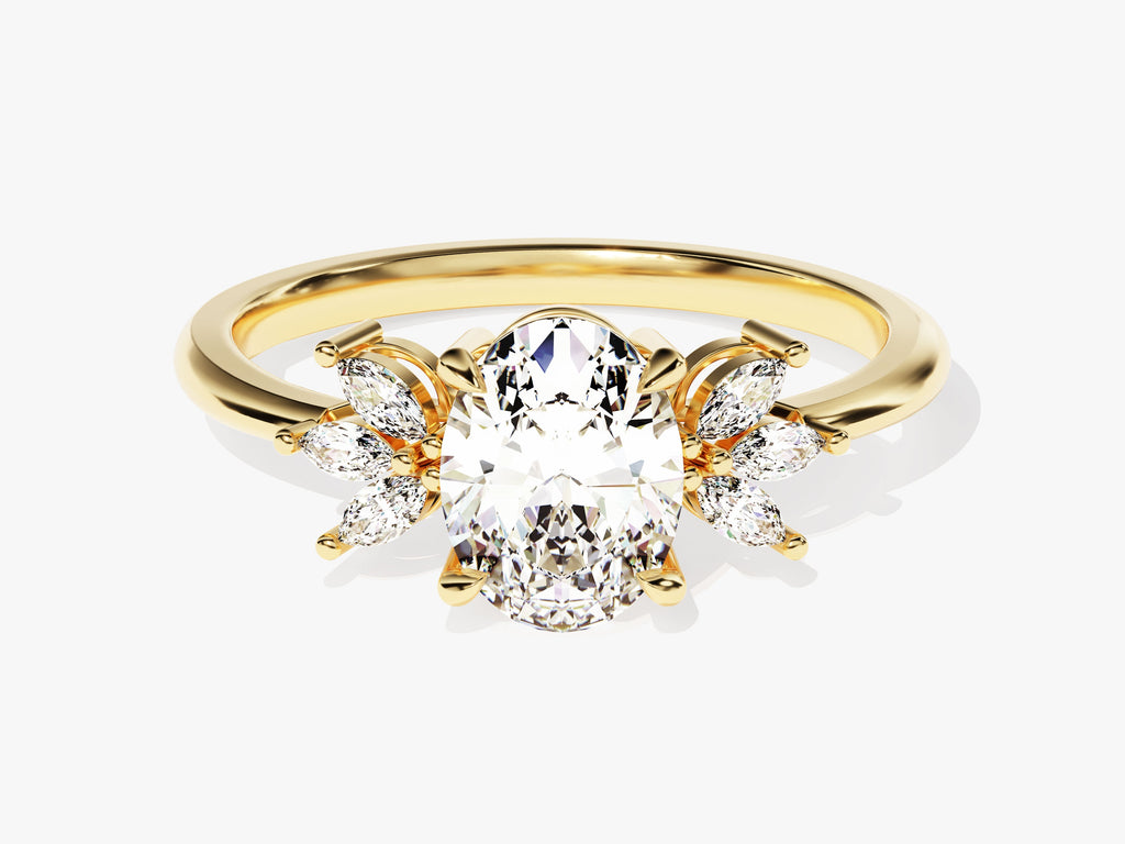 Elegant and charming, this lab grown diamond engagement ring in 14k gold features a cluster of 6 marquise-shaped sparkling stones to complement your oval-shaped center stone.