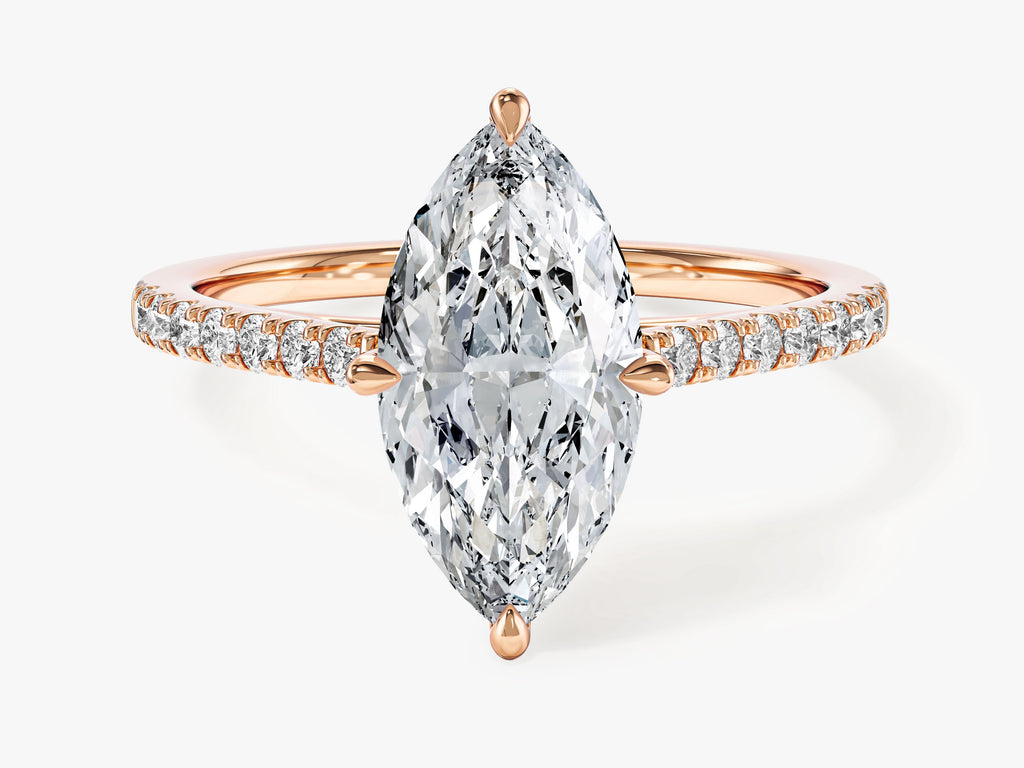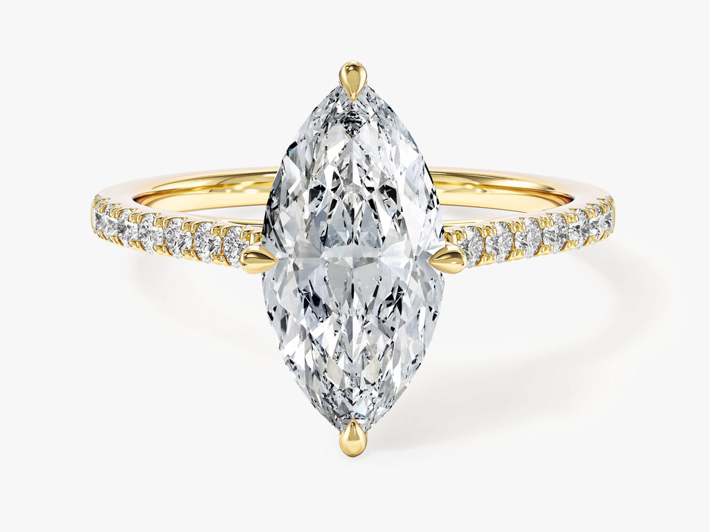 Celebrate your love with the Marquise Cut Lab Grown Diamond Engagement Ring featuring Pave Set Side Stones, an embodiment of timeless allure and modern opulence. The centerpiece of this design is a stunning marquise-cut lab-grown diamond, meticulously created to emphasize its remarkable clarity and captivating beauty. The delicate pave setting adds an extra layer of shimmer and sophistication to the ring.