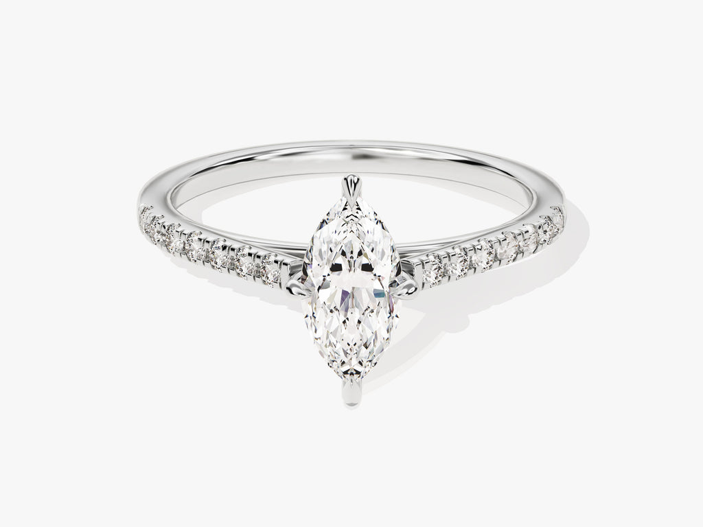Experience the exquisite elegance of our Marquise Cut Diamond Engagement Ring with Pave Set Side Stones, a masterpiece that blends timeless allure with modern sophistication. This exceptional ring features a marquise-cut diamond, meticulously crafted to enhance its exceptional clarity and captivating charm. The band, adorned with meticulously set pave side stones, adds an extra layer of shimmer.