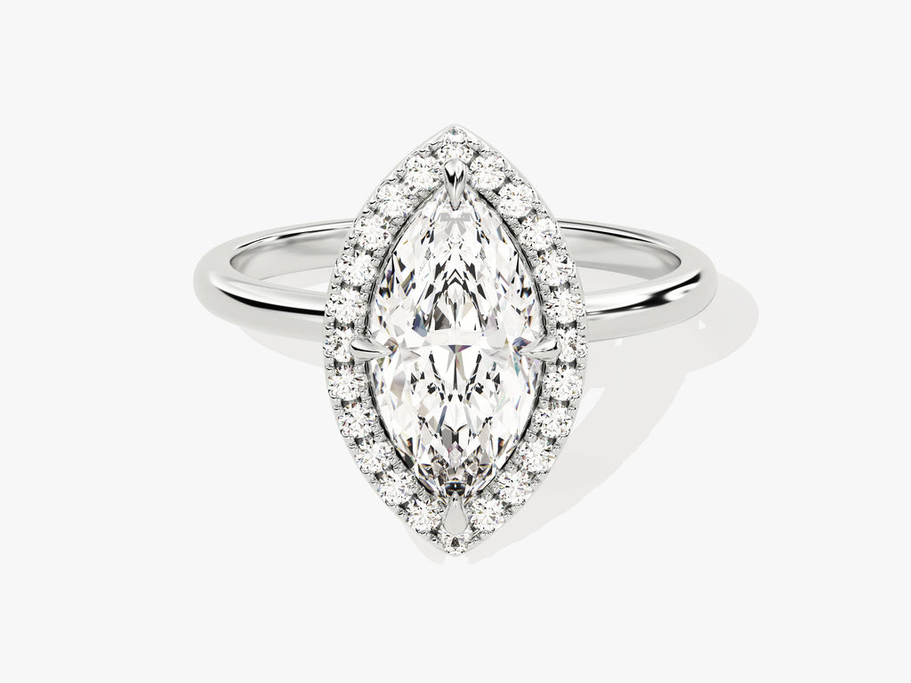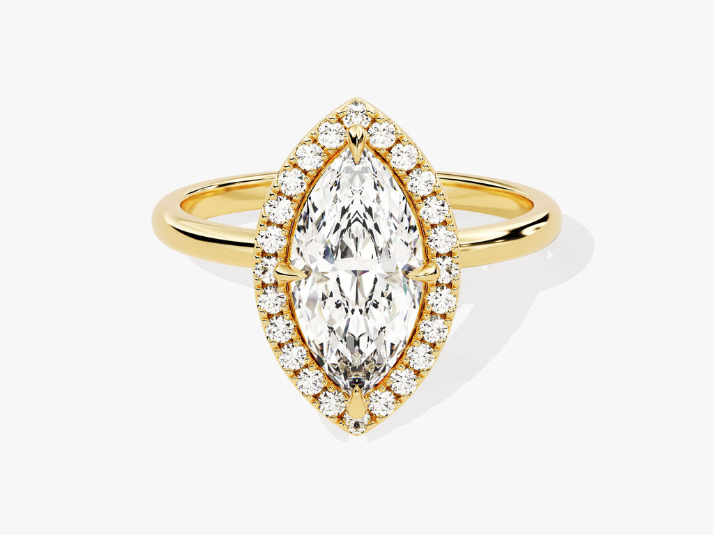Elevate your love story with timeless elegance using our Marquise Halo Moissanite Engagement Ring. This exquisite ring features a stunning marquise-cut moissanite center stone, celebrated for its unique charm and radiant brilliance. The moissanite is beautifully encircled by a halo of smaller stones, creating a breathtaking display of shimmer and opulence.