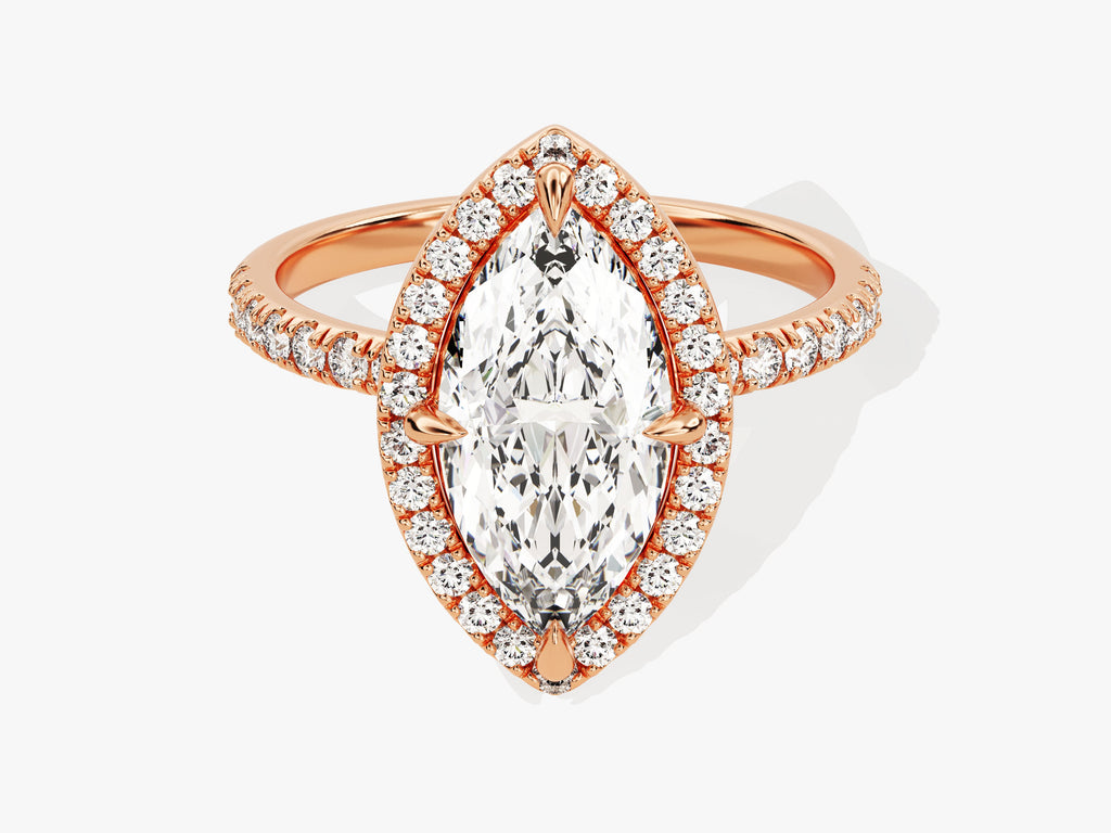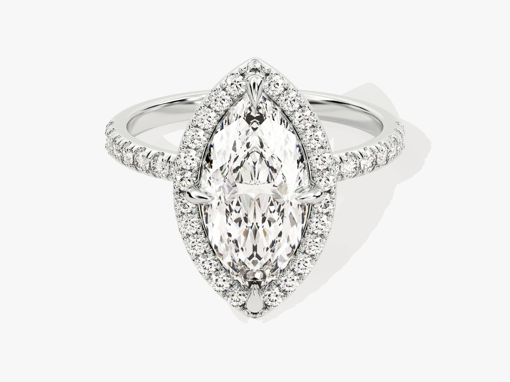Experience the redefined radiance of luxury with our Marquise Halo Moissanite Engagement Ring featuring Pave Set Side Stones. At its heart is a dazzling marquise-cut moissanite known for its exquisite brilliance and grace. The moissanite is elegantly embraced by a halo of smaller stones, meticulously set in a pave style.