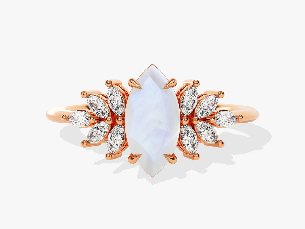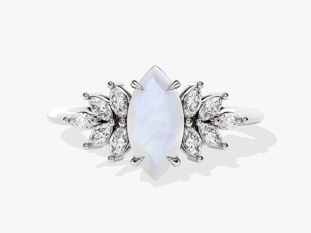 The Marquise Moonstone Vintage Engagement Ring with Moissanite Sidestones is a timeless symbol of love, meticulously designed to capture the ethereal beauty of a marquise-cut moonstone, adorned with the brilliant sparkle of moissanite sidestones in a vintage-inspired setting.