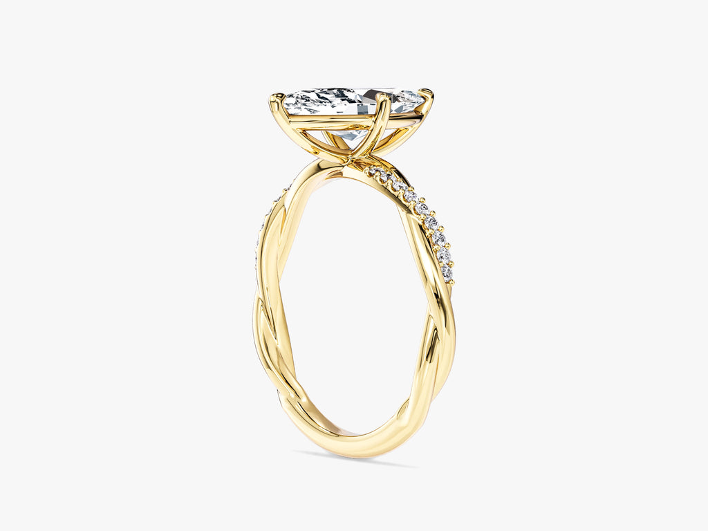 Elevate your proposal with unparalleled elegance and sophistication using our Marquise Twisted Moissanite Engagement Ring with Pave Set Side Stones. This exquisite ring features a stunning marquise-cut moissanite center stone, celebrated for its timeless charm and radiant brilliance. It is gracefully set within a twisted band, adorned with smaller moissanite stones meticulously arranged in a pave style, creating a dazzling display of shimmer.