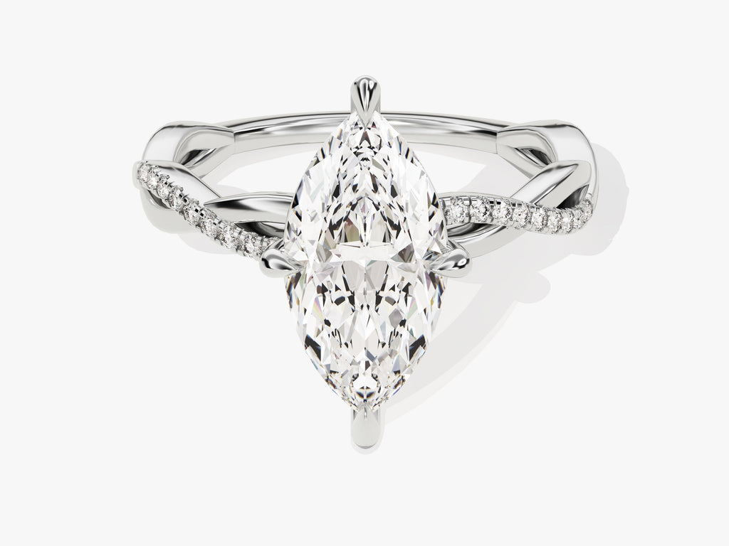 Embrace the profound beauty of our Marquise Twisted Diamond Engagement Ring with Pave Set Side Stones, a masterpiece that combines classic allure with a contemporary twist. This extraordinary ring showcases a brilliant marquise-cut diamond, created to emphasize its remarkable clarity and mesmerizing charm. The unique twisted band design adds a modern and refined touch, symbolizing the intricate and intertwining nature of your love.