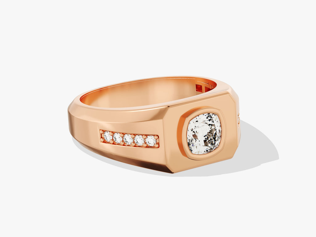 Men's Cushion Moissanite Signet Ring features a striking cushion-cut moissanite gemstone as the focal point, renowned for its exceptional brilliance and fire. The gemstone is set in a band made of gold vermeil, which combines the richness of gold with the durability of sterling silver, resulting in a piece that is both elegant and resilient.