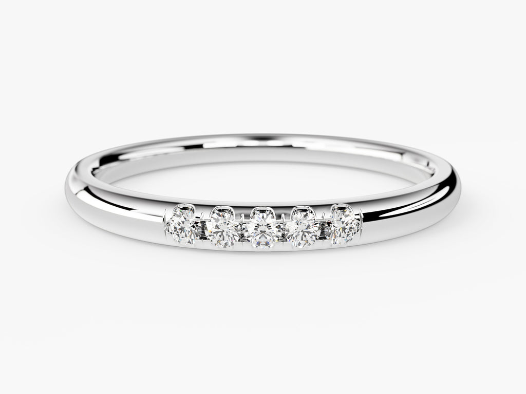 Looking for a wedding band that's both simple and special? This minimalist five-stone diamond band is just the right choice. Five sparkling diamonds grace the band and add a soft touch of twinkle without going over the top. It's perfect for stacking with other rings or wearing solo for a delicate and minimalist look.