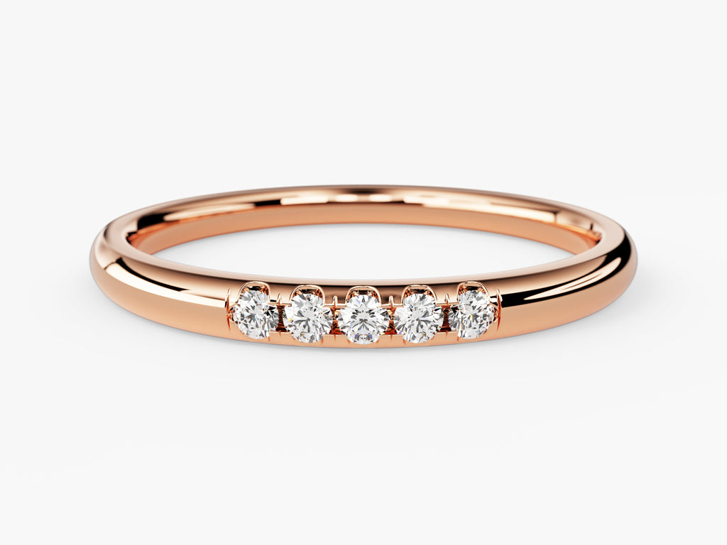 Looking for a wedding band that's both simple and special? This minimalist five-stone diamond band is just the right choice. Five sparkling diamonds grace the band and add a soft touch of twinkle without going over the top. It's perfect for stacking with other rings or wearing solo for a delicate and minimalist look.