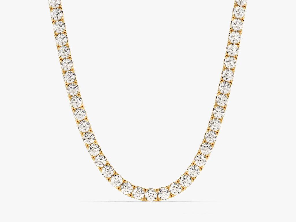 The Moissanite Tennis Necklace is an elegant piece of jewelry featuring moissanite gemstones, each measuring 4.00 millimeters in diameter. The necklace is designed in the classic tennis style, showcasing a continuous line of these brilliant and sparkling moissanite stones.