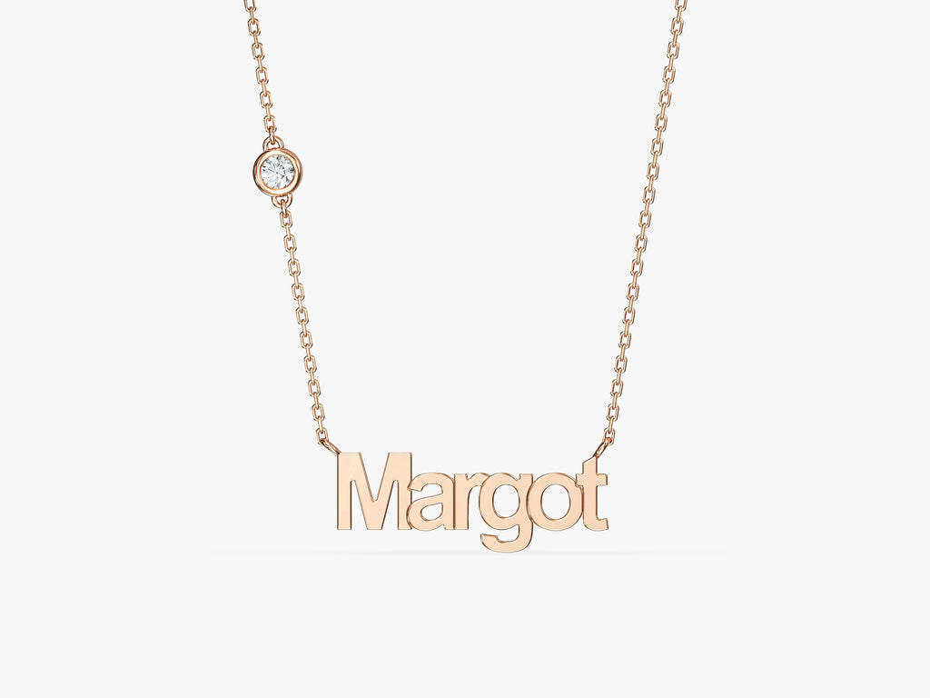 Name Necklace with Gemstone is a personalized piece of jewelry featuring a name or word crafted from solid gold, gold vermeil or sterling silver with a single sparkle incorporated into the design.