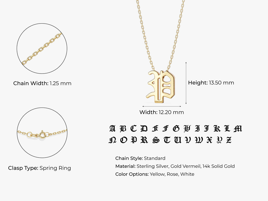 Make a bold yet elegant statement with this Old English Initial Necklace. Featuring a single letter in classic gothic font, this piece blends vintage attitude with modern simplicity. Ideal for everyday wear or as a meaningful gift, it’s available in gold, silver, or rose gold finishes.