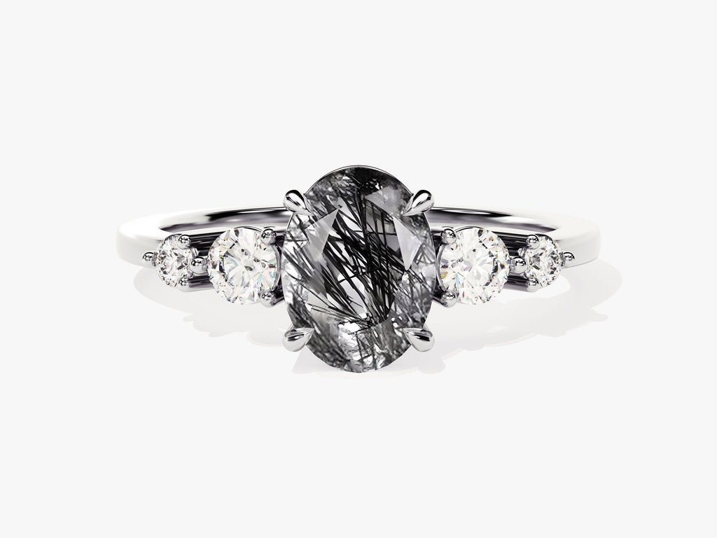 Oval Black Rutilated Quartz Engagement Ring with Moissanite Sidestones