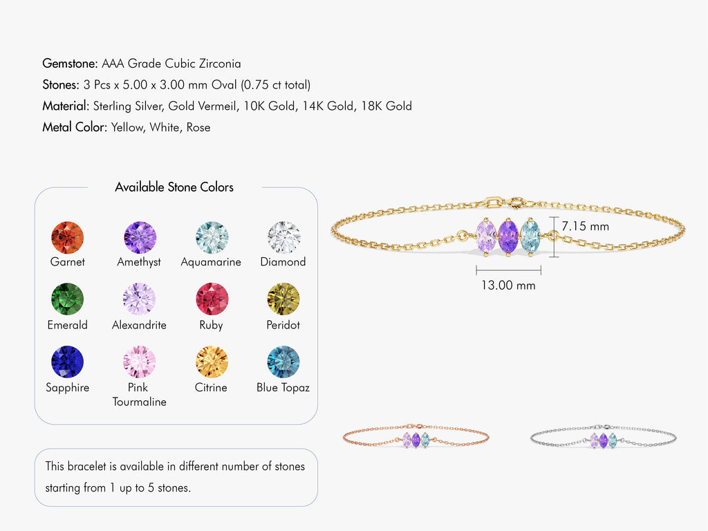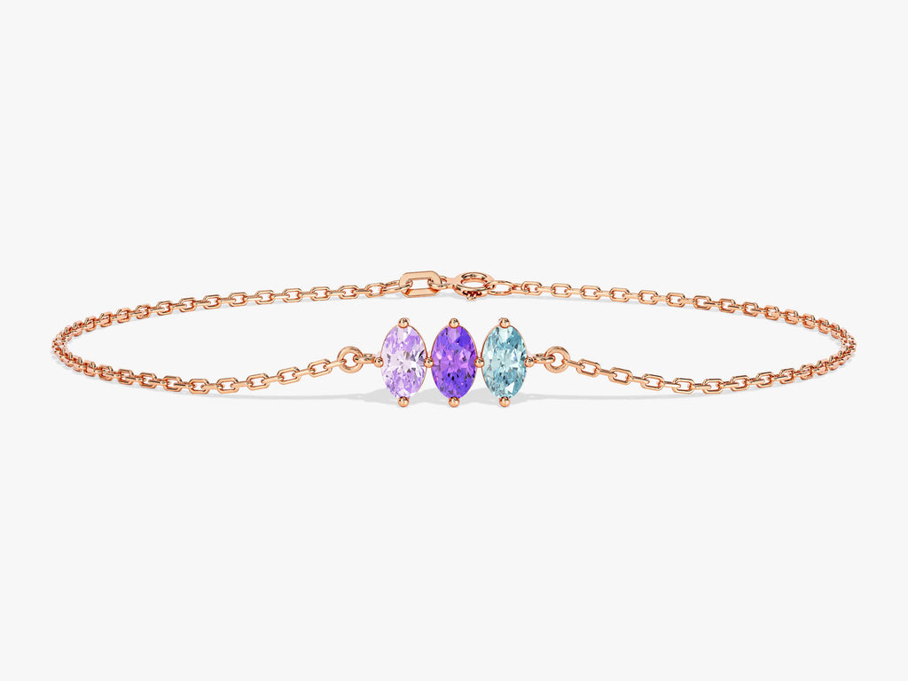 The Oval Cut Multi-Stone Birthstone Bracelet is a customizable jewelry piece that allows you to personalize up to 7 oval-shaped stones, each representing a meaningful birthstone. The oval-cut gems are set in a sleek, elegant design, with each stone symbolizing a special individual or memory.