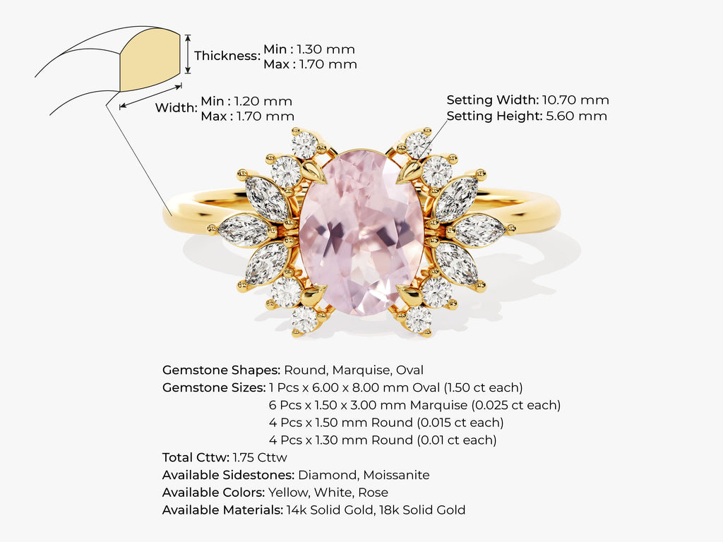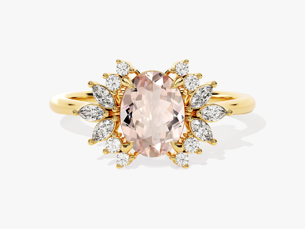 This gorgeous engagement ring has a cluster of shimmering moissanite stones surrounding a gorgeous oval-cut peach morganite gemstone that serves as the centerpiece. The moissanite stones provide a hint of glitz and sparkle, while the peach morganite radiates a gentle, romantic tint.