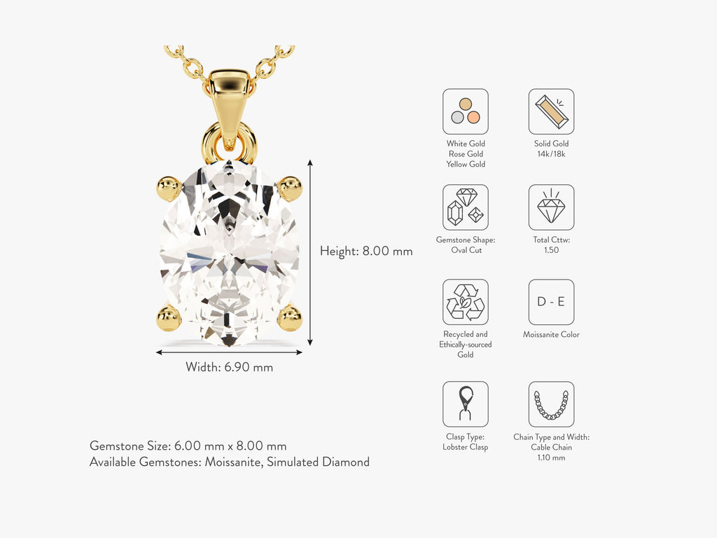 Exquisitely crafted to showcase the unique beauty of its one-carat oval cut lab grown diamond or moissanite with a modern 4-prong setting, this lovely solitaire pendant is attached to a link chain with a length of your choosing. Truly a classic design that is perfect for any occasion.
