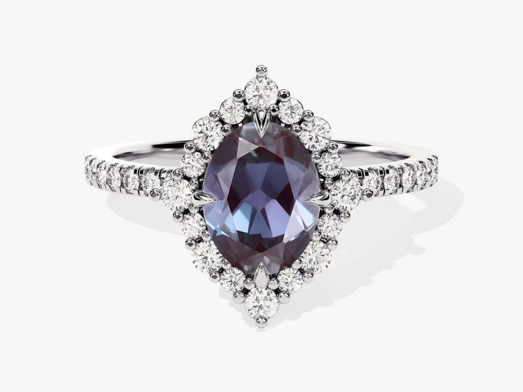 Oval Halo Lab Alexandrite Engagement Ring with Moissanite Sidestones